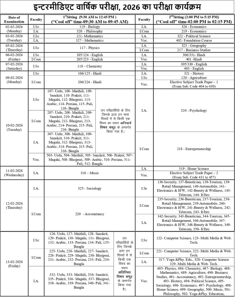 बिहार बोर्ड 12वीं 2026 का टाइम टेबल (BSEB 12th Time Table 2026)