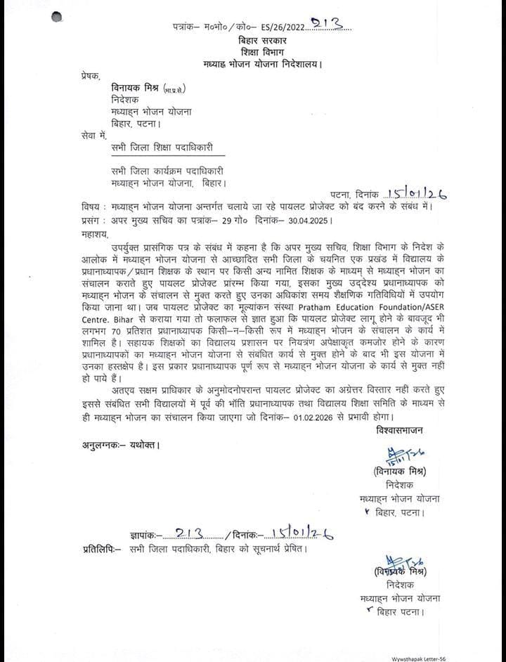 बिहार में मध्याह्न भोजन योजना (Mid Day Meal) के तहत संचालित पायलट प्रोजेक्ट को बंद करने का निर्णय लिया गया है। सभी विद्यालयों में पूर्व की तरह प्रधानाध्यापक या विद्यालय शिक्षा समिति के माध्यम से ही मध्याह्न भोजन का संचालन किया जाएगा। इस पायलट प्रोजेक्ट के तहत जिले के चयनित एक प्रखंड में विद्यालयों के प्रधानाध्यापक की जगह मध्याह्न भोजन प्रभारी के माध्यम से भोजन संचालन किया जा रहा था।