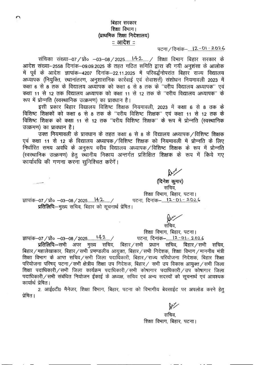 विद्यालय विशिष्ट शिक्षक नियमावली, 2023 में कक्षा 6 से 8 तक के विशिष्ट शिक्षकों को कक्षा 6 से 8 तक के "वरीय विशिष्ट शिक्षक एवं कक्षा 11 से 12 तक के विशिष्ट शिक्षक को कक्षा 11 से 12 तक "वरीय विशिष्ट शिक्षक" के रूप में प्रोन्नति (स्वस्थानिक उत्क्रमण) का प्रावधान है।